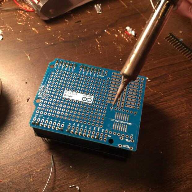 Puede ser más fácil de empezar en el escudo por soldar los pins de cabecera que. Si utiliza pines cabezal apilable puede colocar otro escudo en la parte superior esta si hay siempre una necesidad de ampliar su circuito. Usé lo que tenía en la mano - los pasadores no apilable. Al hacerlo, también puede colocar un botón de reset como ves en mis fotos. No es necesario pero yo tuve uno así que añadido.