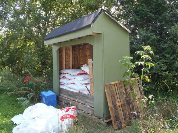 Mi hija y yo construyó un cobertizo madera de almacenaje Pellet para su casa. Ella utiliza su pellet estufa para un gran porcentaje de sus requerimientos de calefacción, su otra fuente es un horno de aceite.
