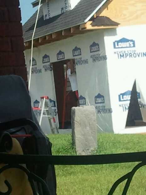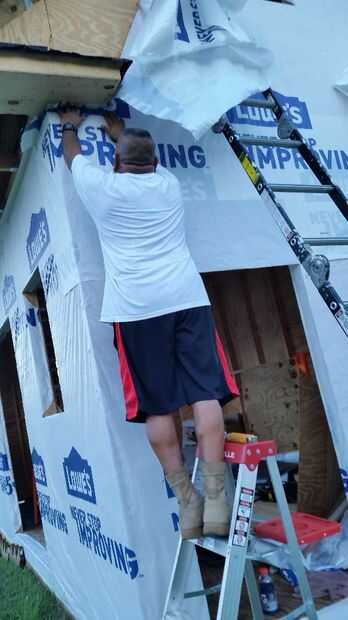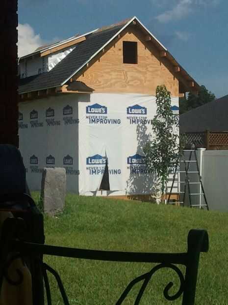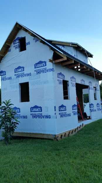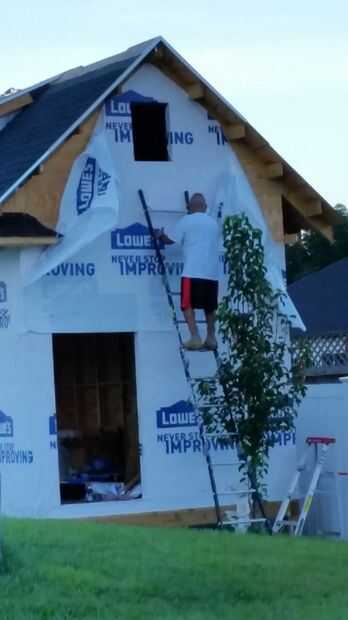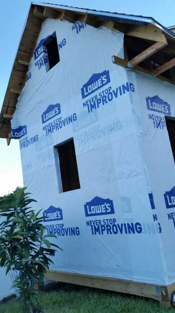 La barrera de vapor se encendió con la ayuda de mi esposa balanceo el plástico de 10 pies. Rodamos el plástico alrededor del edificio una hacia la izquierda para conseguir el emblema de Lowe hacia la dirección correcta. Si usted puede leer, entonces su comercialización en correctamente. Usé grapas de 1/4 de pulgada y la grapadora de martillo para ajustar la barrera de vapor sobre la madera contrachapada. I luego corte y "x" en las ventanas y puertas y dobla los bordes y grapado hacia abajo. Hice la parte superior de la mitad del edificio yo ya no tengo andamios. Dos último usé para hacer el trabajo. Transferí las marcas del perno prisionero en la madera contrachapada en el exterior de la barrera de vapor por lo que es fácil de colocar el marco del techo Junta, trim y porche Hardie.