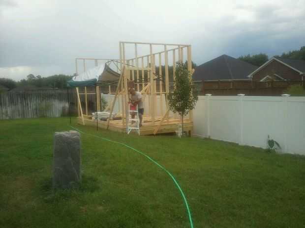 Lo que no tengo es fotos de la construcción del piso. Se construyen básicamente de 6 x 8 x 10 presión de madera con pies de página cada 10 pies en el centro de la estructura de 10 x 20 pies. Se utilizaron placas de refuerzo para juntas a tope y pies de página y las vigas cruzadas. Se construyó un marco de presión de 2 x 6 piso tratado con 24 pulgadas en planta centro viga/bloqueo y apoyar y colocar sobre la base de la viga y se cubrió con madera contrachapada tratada a presión de 3/4 de pulgada. He utilizado la presión para garantizar larga duración y a evitar que las termitas y hormigas carpinteras festejando en la madera. Aerosol de termitas y hormigas asesino fue puesto en, en y alrededor de toda la madera como construí la estructura. Las paredes fueron enmarcadas hasta 2 x 4 x 10 madera de 24 pulgadas en el centro. Estructura básica con paredes delanteras y traseros, siendo los muros. se utilizaron 16 clavos para sujetar los tableros juntos. Ventana y marco de puerta se hizo en el momento que se construyeron los marcos de la pared. Atención a los detalles de las aberturas ásperas es muy importante para que puertas y ventanas pueden ser instalados, sondeadas y aseguradas adecuadamente. Fui por Lowes y consiguió los tamaños de las ventanas y puertas que quería comprar pero no los ha comprado por falta de espacio en mi casa. Además no quería los cristales que dañen el riesgo. Paredes fueron construidas se puso de pie, niveladas y conectadas. Las paredes se realizaron con arriostramiento diagonal hasta que el revestimiento de madera contrachapada se añadió. Aseguró que estaba siempre pensando adelante y asegurado bloqueo fue colocado para futuros revestimientos tanto dentro y fuera del edificio. Ordené el piso de vinilo para el almacenaje del edificio unos meses antes de que el proyecto comenzó porque el artículo era sobre pedido. Pavimentos para garajes y es un suelo de vinilo de tráfico pesado que tiene su propio adhesivo. Sólo la cáscara y colocar en el piso.