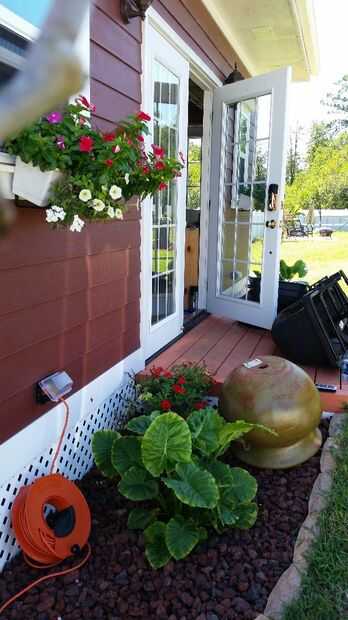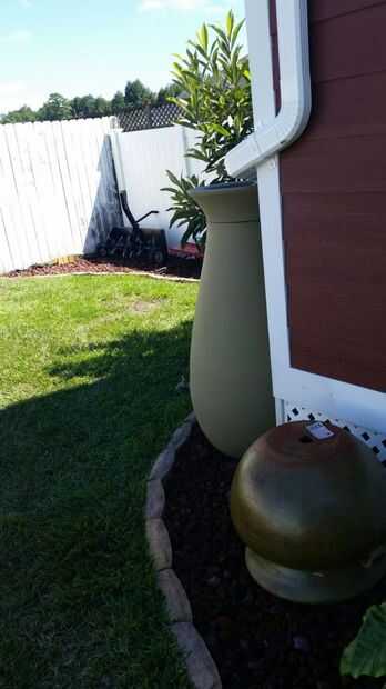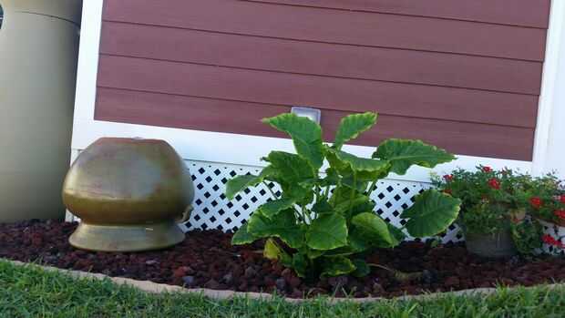 Paisajismo es una parte crítica de la presentación así que tome mi tiempo para decidir lo que quiero usar. Roca de lava piedra, borde, blanco oscila alrededor de porche, tanques que recogen del agua y las plantas. Yo utiliza flores blancas y rojas y después sólo con las flores rojas en los plantadores de la caja. La vegetación también es importante. Los tanques se utilizan para regar las plantas alrededor del edificio de almacenamiento y para mi proyecto de futuro de casa verde.