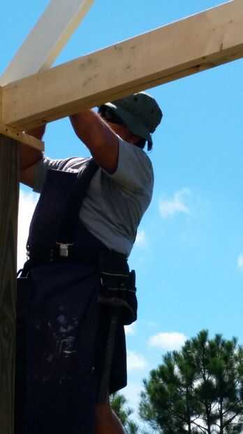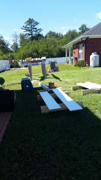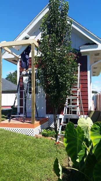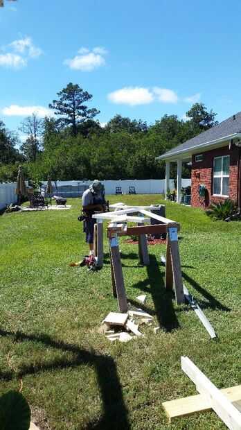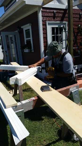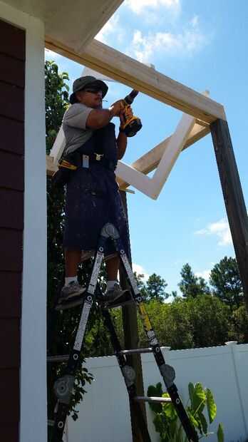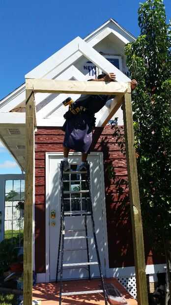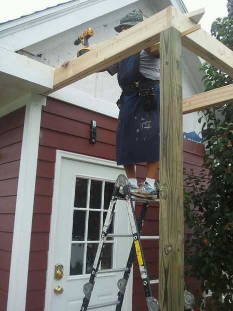 Decidí ir con cuadrados de pilares o columnas y un techo tipo catedral para mi porche. Mi casa tiene postes de columna cuadrada 12 x 12 pulgadas en el patio trasero así que pensé mezcla en tener columna cuadrada 4 x 4 puesto en el edificio de almacenamiento de información. He utilizado la presión tratada 4 x 4 entradas y enmarcado el techo con tablas de 2 x 6. Utilicé tornillos de construcción de 3 pulgadas para sujetar todo juntos. Pinté el post y el marco blanco brillante. El post tuvo cerca de 5 capas para pintar y mantener blanco debido al tratamiento de la presión. He usado masilla de madera para cubrir todas las imperfecciones de la madera y tornillos y lija todo antes de pintar.