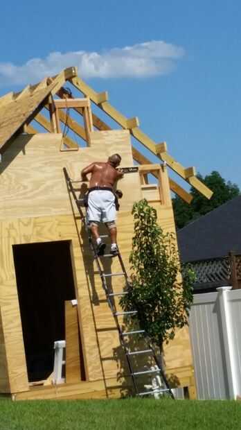 Utilicé madera contrachapada 1/4 de pulgada de espesor para revestimiento exterior. No quiero malgastar dinero en madera contrachapada tratada a presión porque voy a cubrir el edificio entero en vapor de construcción bearier. Madera contrachapada fue sujetada con clavos de 10d cada 6 pulgadas. Cuidado fue tomado para marcar todos los ESPARRAGOS y bloqueo para futuras fases del proyecto en el exterior de la madera contrachapada. Toma el trabajo de la conjetura de encontrar las vigas al colocar el revestimiento exterior y trabajo del ajuste. Tejas fueron comprados antes de tiempo para el tipo y costo no cambiar o agotado. 10 años garantía también fue tomada en cuenta por lo que no tengo que reparar el techo en el corto plazo. Cumbrera y cumbrera fueron comprado al mismo tiempo, así por la misma razón. Almacenamiento de material para techos es fundamental como 100 más grados en Georgia cuando comencé este proyecto y que tenía que garantizar que las tejas no se peguen uno al otro debido al calor.