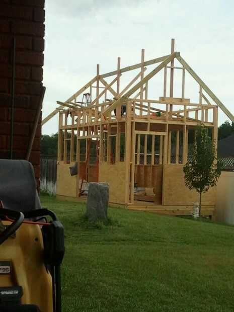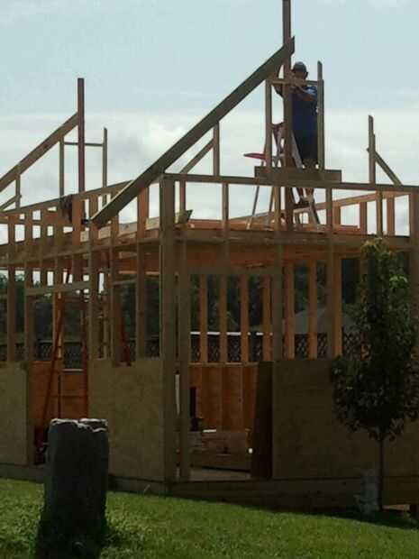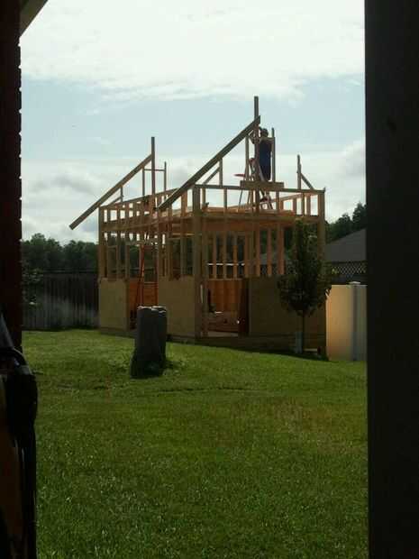 Enmarcar de la azotea fue construida usando una tabla de canto y luego trabajar de eso para construir el techo a dos aguas. No había Tomas Valle porque el techo del frente de centro fue un magro al tipo para la ventana delantera. Construí los hastiales de izquierda y derecho primero y luego construyó el marco de la ventana, seguido por el techo del centro. La parte posterior de la azotea fue construida justo después de los dos hastiales frente fueron hechos para asegurar que el techo me alojé recto, escuadra y nivel. Usé algunos ingenio para apoyar el material para arriba para asegurar tablas. Ya que estaba trabajando sola esto me necesita. Pensar dos pasos por delante también viene bien para asegurar una acumulación suave de enmarcar al revestimiento para techos, etc.... La azotea tenía huracán correas y soportes truss para fijar tableros. Línea de cadena se utilizó para mantener línea de cresta recta. Arriostramiento temporal centro fue utilizado así para mantener a todo nivel y a plomo.