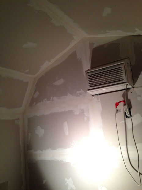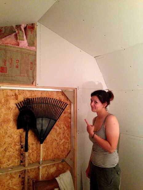 Después de aislamiento era tiempo para hacer las paredes. Mi mejor Linden amigo vino encima para una visita de beber cervezas y colgar drywall. Ella tenía un poco más experiencia en la instalación que hice (que NO experiencia) e hizo fácil el trabajo de él, incluso perfectamente cortar la extraña ángulos donde la pared se une con el techo del granero-estilo. Pasamos toda la noche riendo, bebiendo, poniendo en mampostería seca y cubriendo así todo quedará bastante cuando fue pintado.