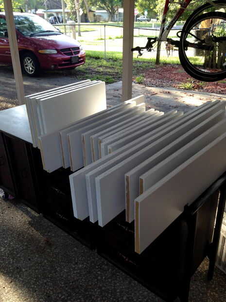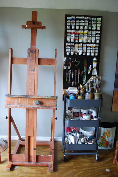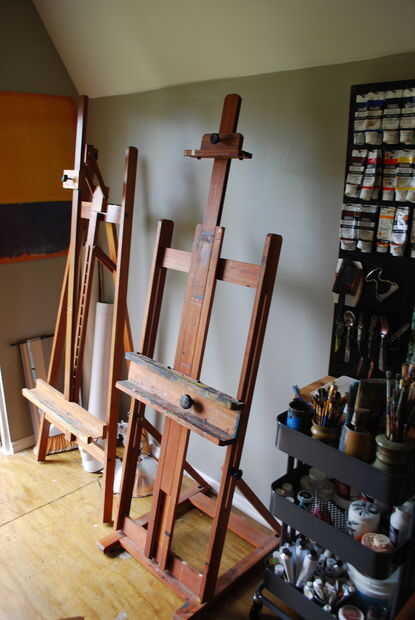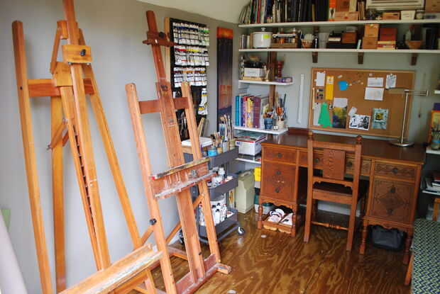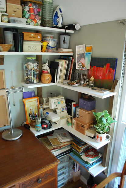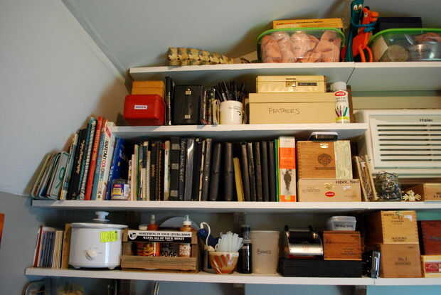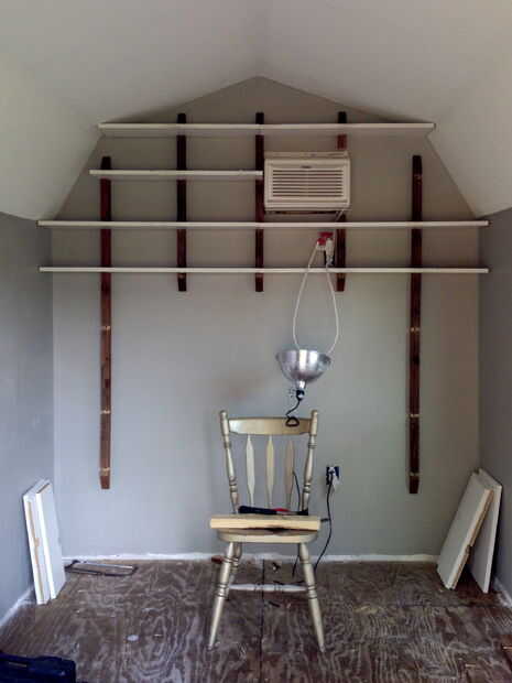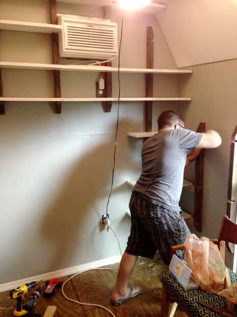 En el punto de la nave era esencialmente una habitación terminada con una hermosa ventana y aire acondicionado. Mi suegro y me construyeron estantes para el espacio con este instructable clásico, y usé tinte sobrante y pintura de otros proyectos para acabar con. Los estantes son increibles en serio. Usted debe cubrir su casa en su genialidad. Una vez en los estantes había sólo una cosa por hacer, mover todas mis cosas de arte en el estudio!