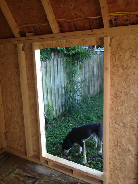 Encontré una ventana escarpado con descuento en Home Depot--$40 en vez de $197. Era mucho más grande que yo estaba pensando para mi vertiente, pero en $40 por una ventana nueva, energy star, doble acristalamiento, era incluso más barato que el windows más viejo que encontré en el hábitat para restaurar la humanidad. Usando los pernos de desecho de la gran plataforma de madera, enmarque la ventana, galpón de esquinas y una unidad de aire acondicionado en la pared usando conocimiento otorgado a mi cerebro de la maravillosa internet.