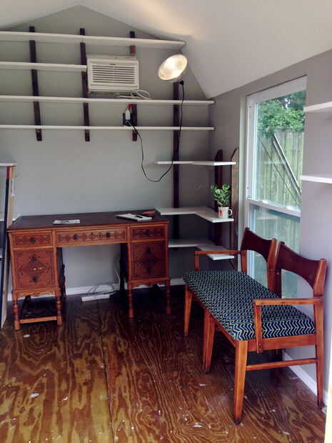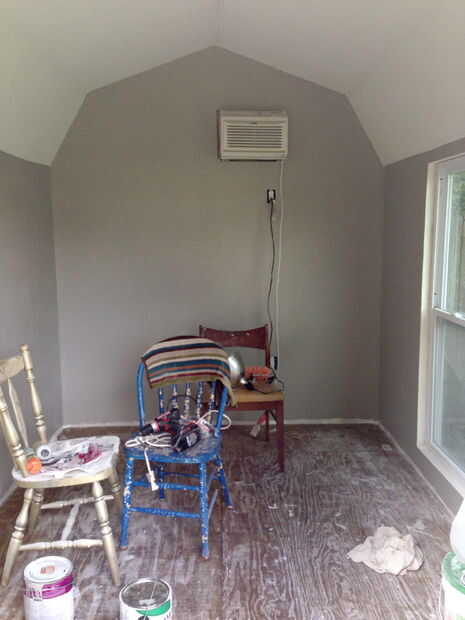 Ya que tenemos tantos amigos maravillosos que vinieron a ayudarnos y utilizamos un montón de trozos sobrantes y pedacitos en el proyecto, el costo para convertir la nave en mi estudio de arte fue bastante bajo. Agregar eléctrico, aislamiento, la ventana, paneles de yeso, pintura y zócalo era poco más de $500. La madera y hardware para construir e instalar los estantes era cerca de $80.