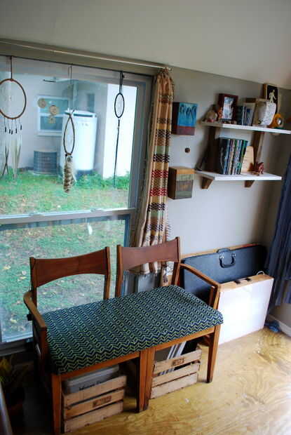 A continuación pongo unas cuantas capas de poliuretano de baja en el piso de madera contrachapada. Puedo añadir más substancial del suelo más adelante, pero mi prioridad es tener un piso fácil de limpiar y que me parece bien que cubierto en pintura salpicaduras, barro y cualquier otro tipo de desorden hacen. No soy un artista limpio, y yo he pagado muchos alfombra mancha en mis días de alquiler de apartamento. Después el barro en las paredes y el techo estaba secado, había cubierto todo en una imprimación de yeso y luego en pintura nos sobras del resto de nuestra casa (y algunos pintura techo blanco detrás de la izquierda, puntuación). He comprado un montón de zócalo en el hábitat para restaurar la humanidad para un total de $6 y era más que suficiente para que la nave entera.