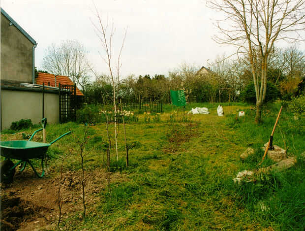 En las fotos anteriores vemos cómo Planeamos nuestro jardín desde el principio para incorporar cobertura. Cuando llegamos a este campo abandonada y ruinas de la casa, nuestro primer pensamiento fue a la planta se rompe viento o cinturones de abrigo para reducir la sequedad y escalofriante efecto de los vientos del oeste de la bahía. Viajamos en moto en esos días, pero es sorprendente cuánto raíz desnuda haya y Carpe de la cobertura se puede llegar a la parte posterior de un tourer anticuado.