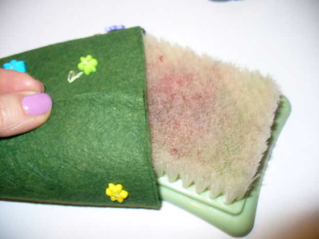 1. sentido de las dos capas de fieltro juntos utilizando su herramienta de la aguja para empujar varias veces alrededor del perímetro de las piezas del patrón y luego a través del centro de patrón de fondo de fondo verde. Los bordes deben ser de fieltro bien juntos, pero el centro puede ser sólo vagamente "viró".