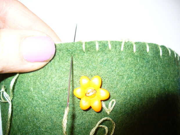 2. Utilice hilo de bordado para colocar botones de flor y puntada recta o la puntada de cadena para bordar el tallo de la flor.