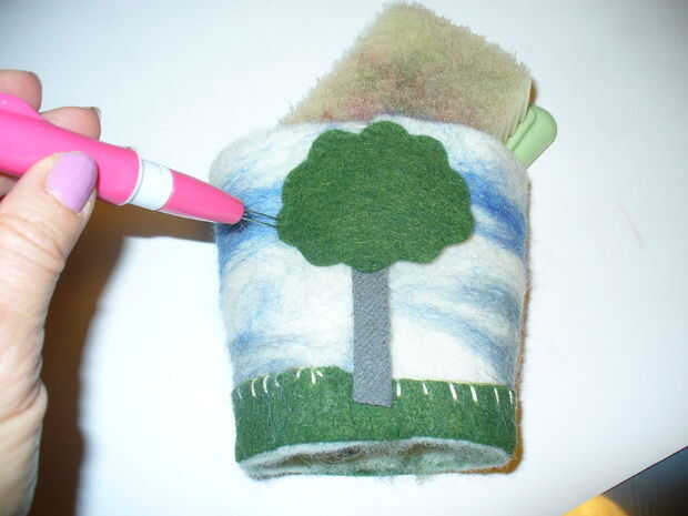 7. Coloque la parte superior del árbol verde y el tronco de fieltro gris sobre la costura del fondo y sentí en su lugar.