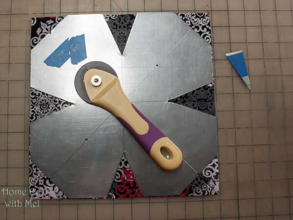 Mi esposo me ha hecho una útil plantilla para este paso. Sin esta plantilla tiene que marcar un poco. Desde la línea de centro mide 3 1/4 pulgadas a la derecha derecha y a la izquierda en los cuatro lados. Usando la regla y el cortador rotatorio corta las cuatro esquinas, utilizando las líneas que trazaste. Cortar muescas y proceder como en el paso 4.