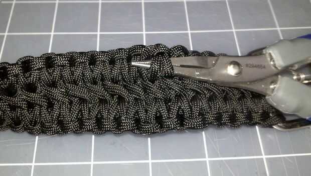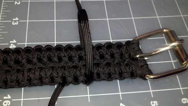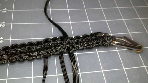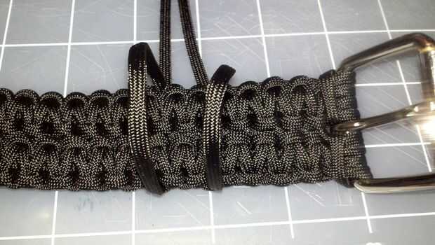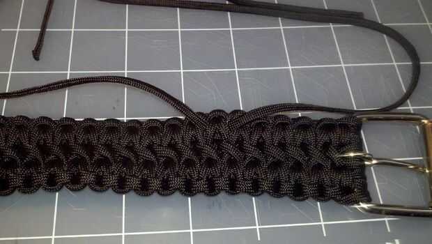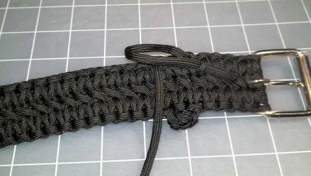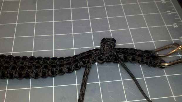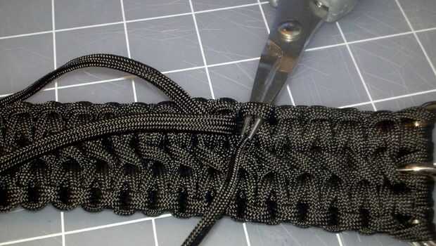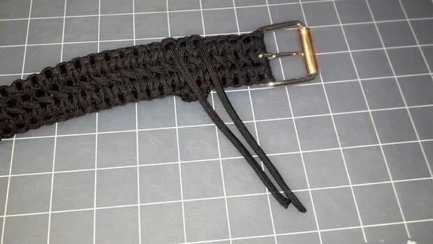 Después de atar el nudo pasado, recorte los extremos de trabajo les derrite y tejerlos en la parte posterior de la correa.