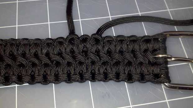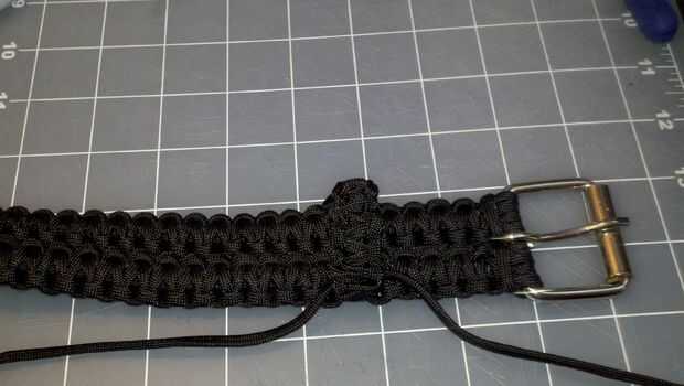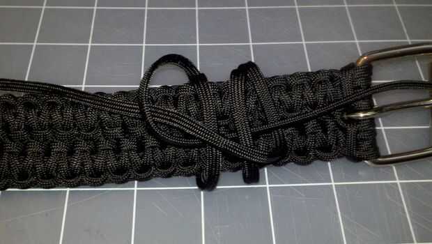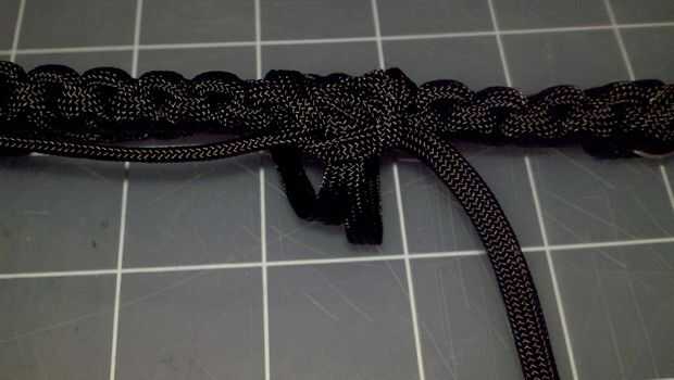 Tratar los lazos en la parte delantera de la correa como los hilos de núcleo y los extremos sueltos de la cadena como la cadena de trabajo, una serie de nudos cuadrados que conducen hacia el lugar donde primero se inserta el filamento en el cinturón del cajón.