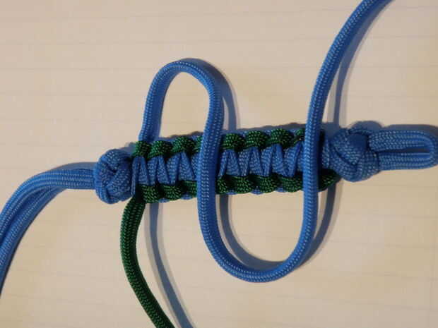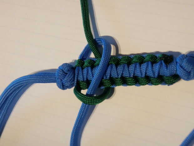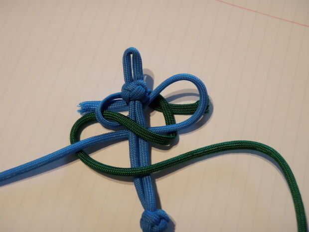 -Ponga la pieza detrás de la otra pieza con nudos de cordón, igualmente en ambos lados (nudo cuadrado centrado)