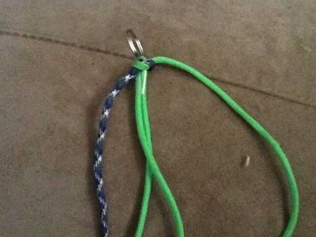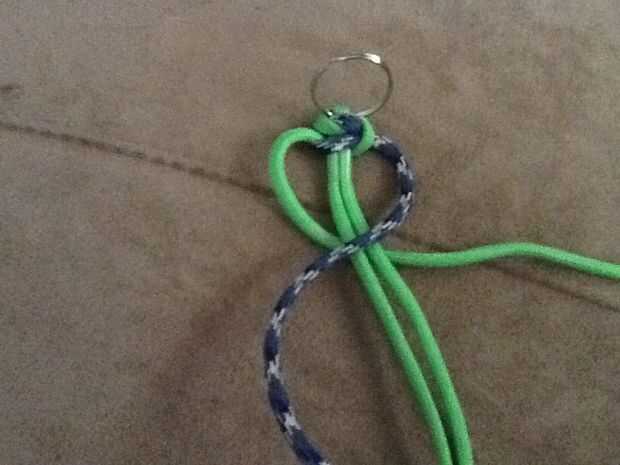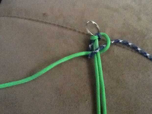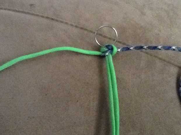 3. repetir los dos primeros pasos hasta llegar al nudo de diamante. Asegúrese de que mantener los colores en el mismo lado empezaron en. Por ejemplo, empecé con verde en la parte inferior y camo azul en la parte superior. Para la trenza toda el camo azul se queda en la parte superior y el verde se queda en la parte inferior.