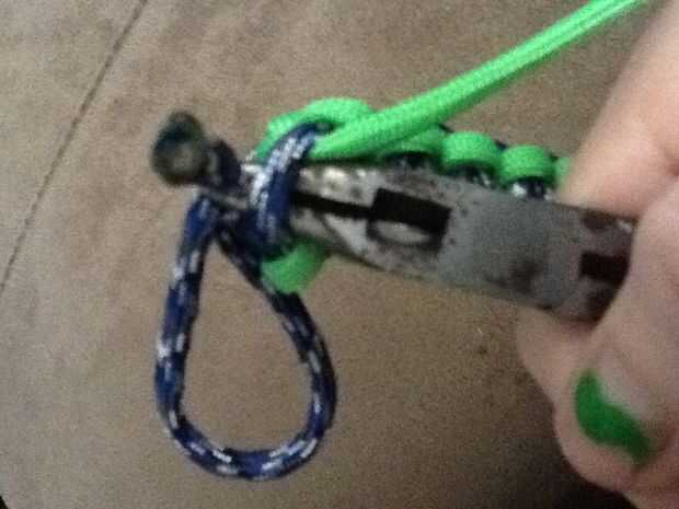 Tire las cuerdas restantes debajo de la trenza. Esto impide que la trenza cayendo a pedazos. Sugiero que tirando de él en al menos tres de los puntos de sutura. Probablemente necesitará usar sus alicates de punta de aguja para esto. Apagado cualquier exceso de cordel que puede ser y luego fundirlo en la trenza. Si nos fijamos en la segunda foto, puedes ver cómo se derrite el extremo de la cuerda en la trenza.