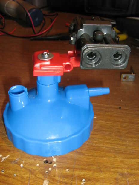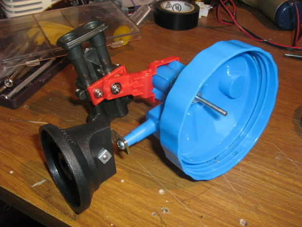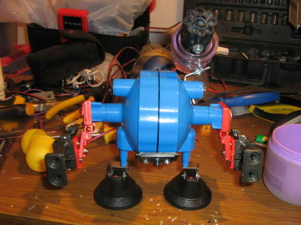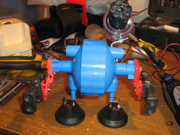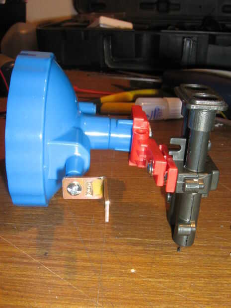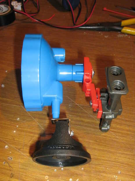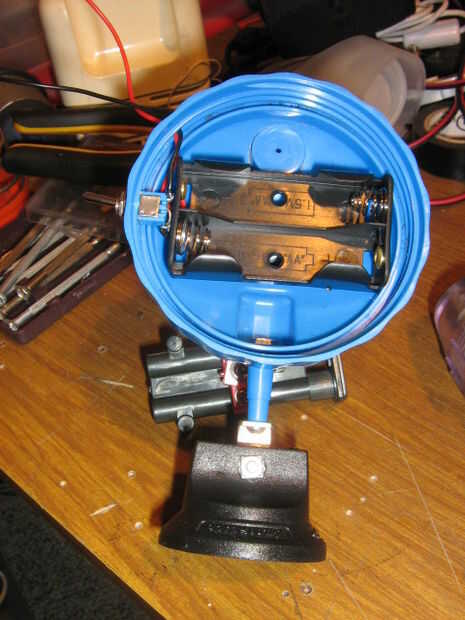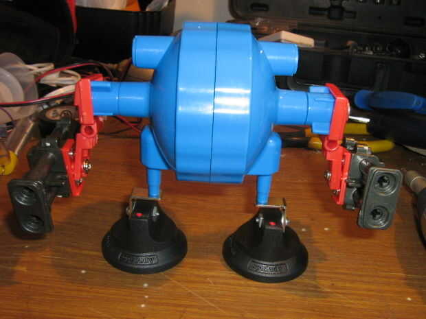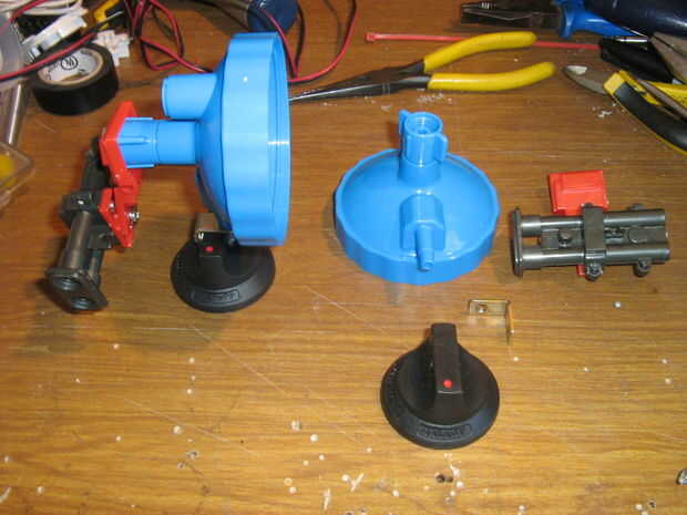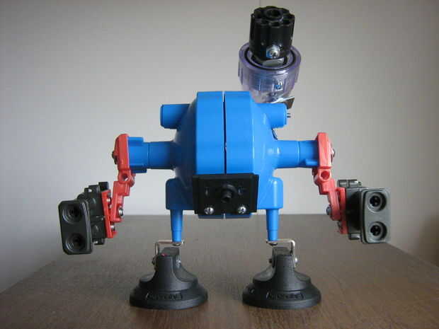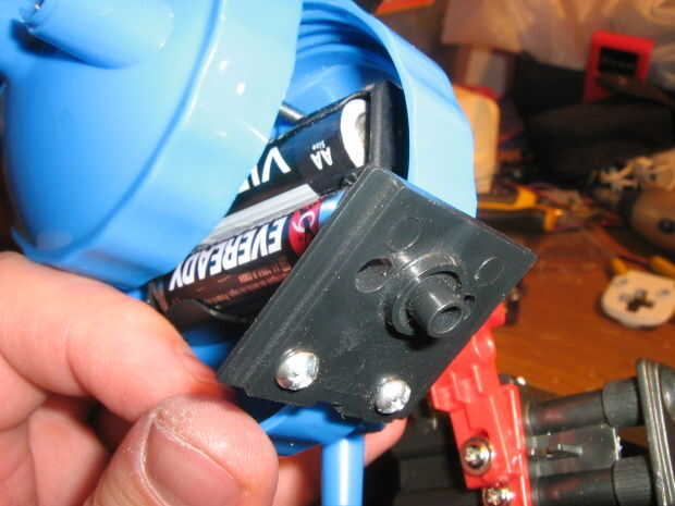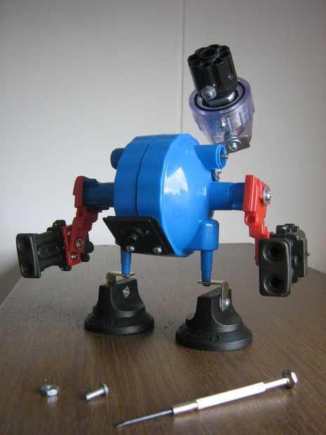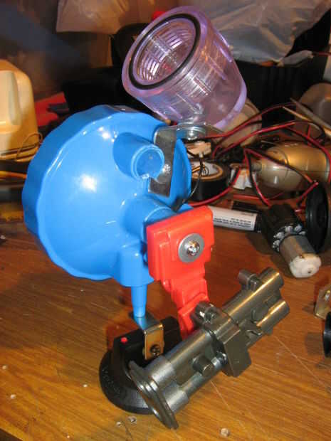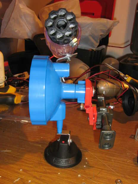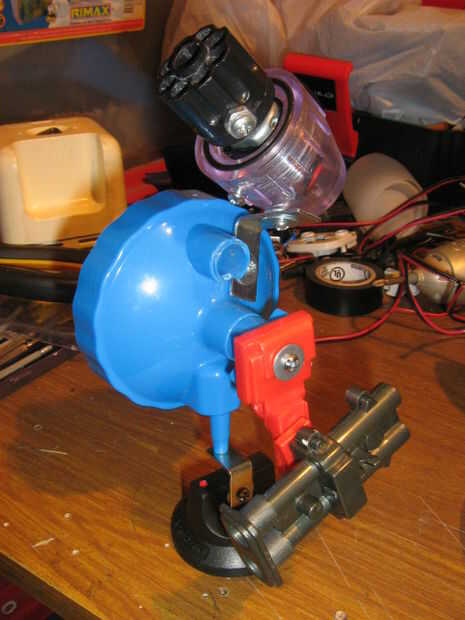 Este droide de combate es un vibrobot simple. Utiliza 2 pilas AA conectadas a un motor de peso desequilibrado con un interruptor para la activación. Está compuesto por dos partes, cada una con una tapa azul grande de un filtro de aire, una perilla de horno como pie y un arma de acción figura como brazo (encontré interior dañado arma de Max Steel para niños. No puedo encontrar su nombre, pero cualquier arma del juguete podría ser útil).