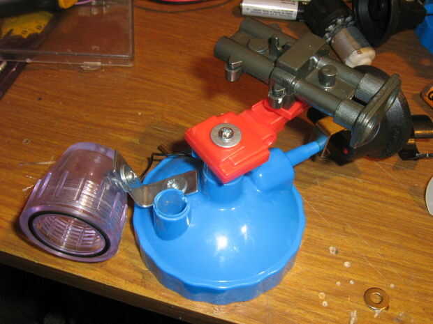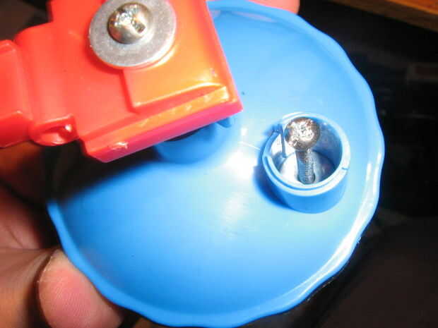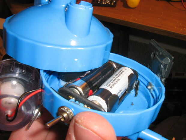 Ambas partes se unen mediante una bisagra, elaborada con un tornillo largo y dos pequeños cilindros de una barra de labios, para que pueda abrir cuando tienes que cambiar las pilas.