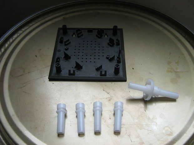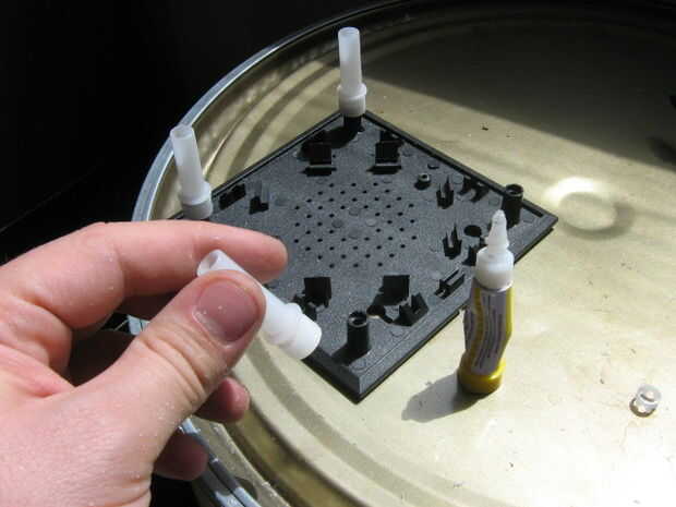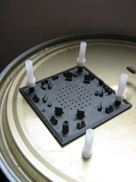 Si el cangrejo va a ser en medio de la bahía, tendrá una plataforma para alojarte. Usar una placa de plástico cuadrado de un dispositivo electrónico y cuatro boquillas de alcoholemia como pilares. Inserto cada uno en cada ángulo de la Plaza, con pegamento y tornillos de fijación. Luego lijas todo para el siguiente paso: pintura.