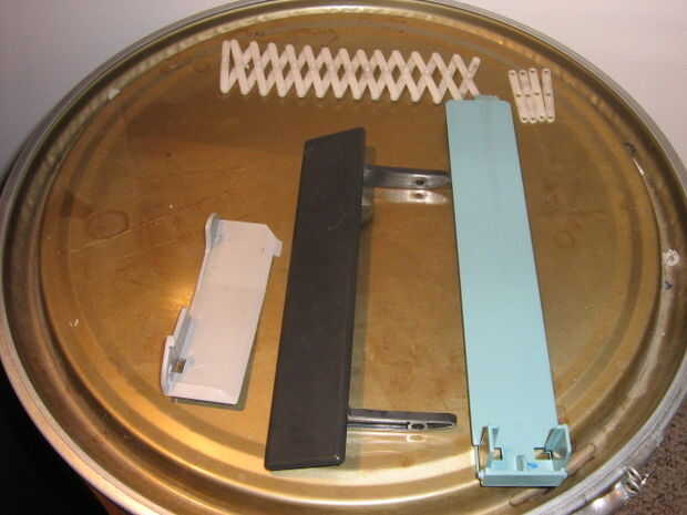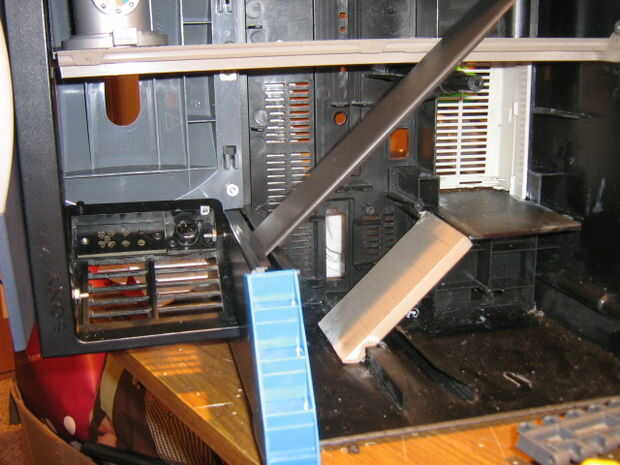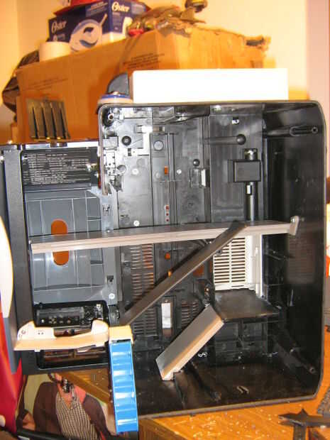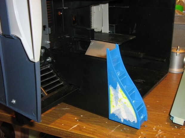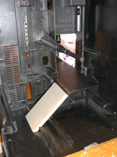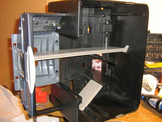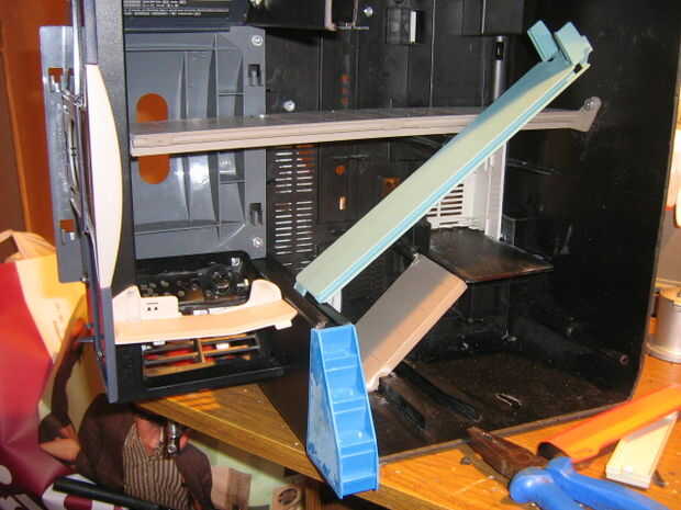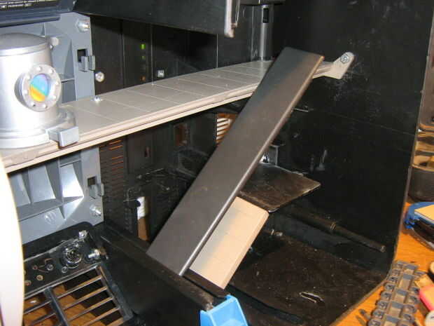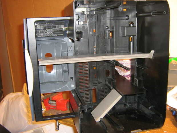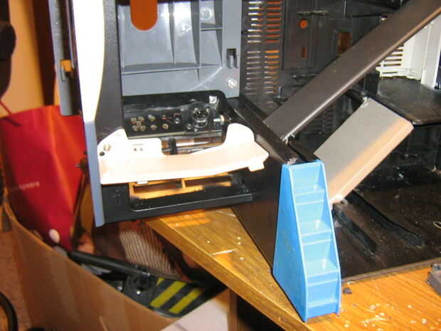 Para el segundo piso, utilizo la bandeja de una máquina de escribir eléctrica. Os adjunto a la pared mediante pernos, tornillos y ángulos de hierro. Algunos platos de la impresora será rampas y grandes plantas auxiliares. Encontré las escaleras de un juguete y adjunto a la división entre el lado y la sala principal.