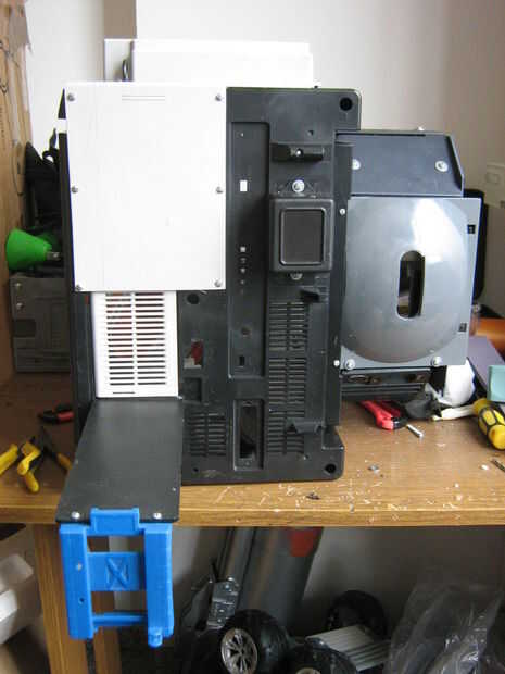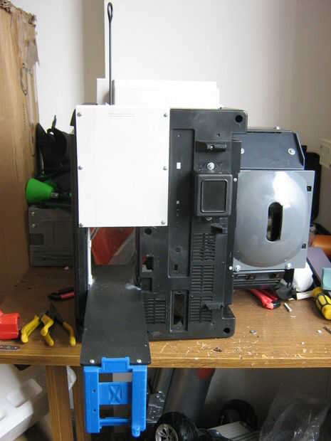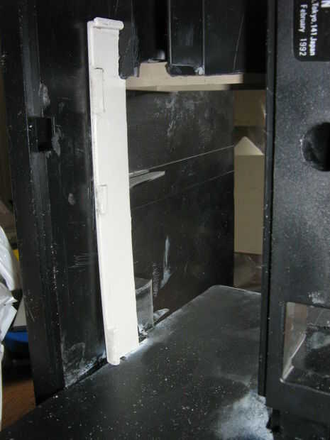 Por la puerta, me encontré con un pedazo de impresora que se ajusta y desliza perfectamente en la caja de las pilas de la grabadora, así que hice una puerta deslizante sube y baja gracias a una barra de metal. Con algunos arañazos plásticos hice los rieles de la puerta. Utilizo placa rectangular de la impresora para cubrir la puerta cuando se abre. Un gran logotipo COBRA estará en esta placa.
