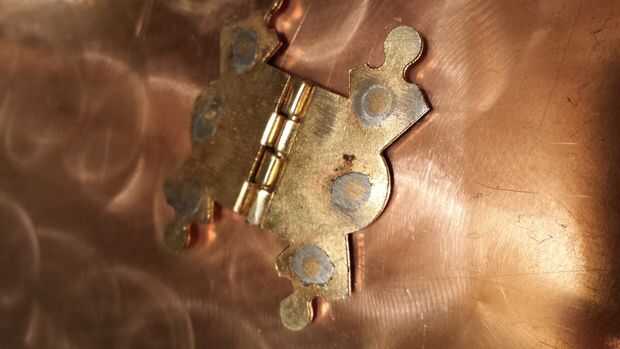 Las bisagras fueron ya preparadas por soldar los tornillos de latón en los agujeros. El plan era luego de la soldadura y utilizar araldite para pegar en su lugar en la cubierta.