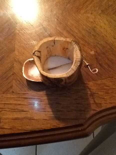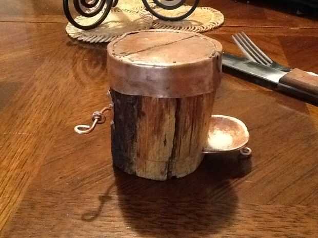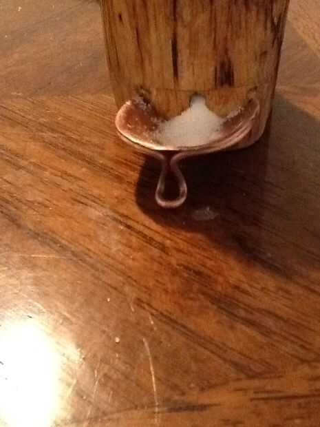 9. forma de la cuenca y partes de otro metal que forja de necesidad (golpe con un martillo y frotate con el sudor de tu frente) la cuenca fue soldada a un trozo de alambre que forman una pata de apoyo, el alambre se envuelve alrededor de la cuenca y continúa en la base del IVA preparando la cuenca contra el pozo