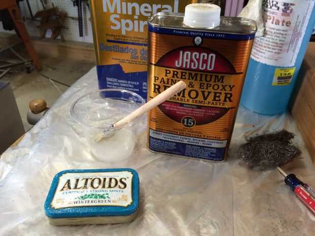 Usted también necesitará una brocha cerda natural disponible (no espuma!) que le Unte el removedor de pintura en su lata altoids. Ser liberal, asegúrese de que el gel recubre toda la superficie que va a tira. (Hacerlo en dos pasos, primero la parte superior y luego la parte inferior). Siga las instrucciones en la lata, pero normalmente tendrá que esperar durante 15-20 minutos, mientras que el extractor funciona (cuando ya su frío).