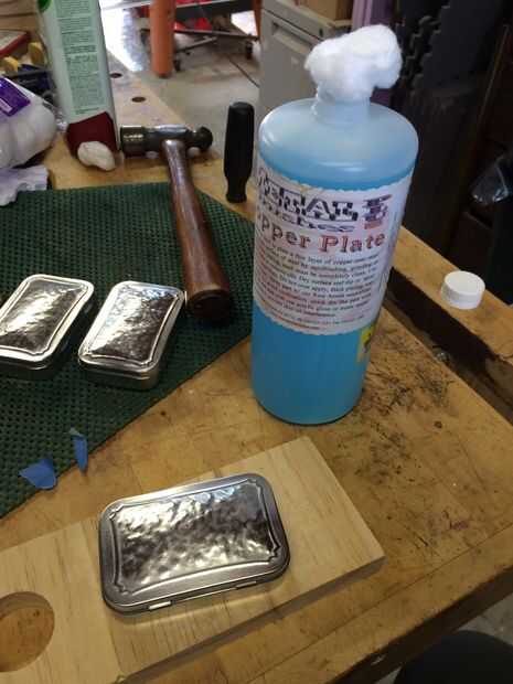Ahora colóquese guantes de nitrilo otra vez y tomar bolas de algodón o un trozo de trapo de algodón mojado con el cobre galjanoplastia final del Metal (www.metalfinishesplus.com) y luego comenzar a frotar toda la superficie del metal. ESTA ES LA PARTE COOL! La reacción química resultante se realmente de la placa de la superficie del acero con una capa delgada de cobre justo antes de sus ojos! Evitar mojar la bola de algodón y frotar la superficie hasta lograr el acabado que desee. (la reacción de la galjanoplastia consumirá los productos químicos en la bola de algodón por lo que se necesita más para mantener la reacción en marcha).