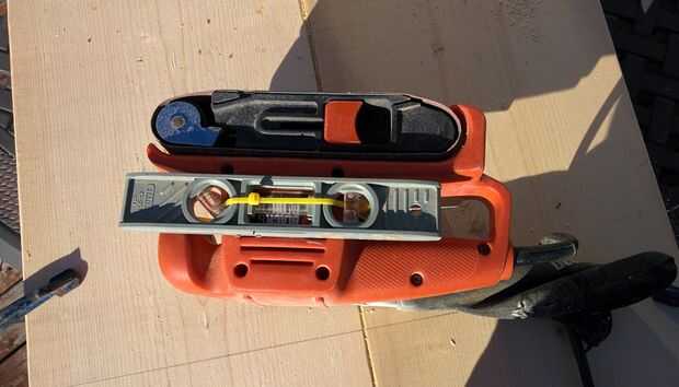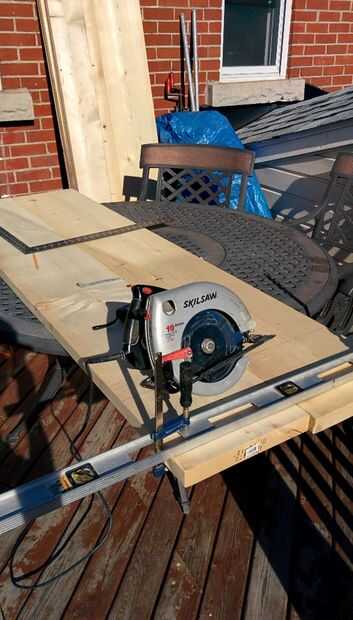 A continuación, para los estantes de ancho, fue cortado a una longitud uniforme y luego repetir el proceso agujero de bolsillo para colocar las breadboards. En este caso, es importante para el lado del corte era perfectamente plano (por el pegamento para hacer un buen trabajo), así que utilicé una lijadora de banda. Uno de los problemas que había tenido en el pasado con la lijadora, sin embargo, fue que era muy fácil empezar inclinándolo unidireccional hacia arriba o hacia abajo sin darnos cuenta, y no esto terminaría en un borde perfectamente vertical. Para contrarrestar esto, he atado un nivel al lado de la lijadora y acabo de ver la burbuja todo el tiempo. Mientras la burbuja se centró, la lijadora era e iba a venir mi borde vertical y agradable.