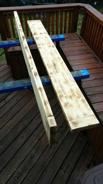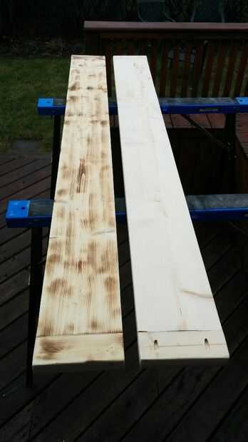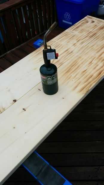 Esto es donde comenzó la verdadera diversión. Nunca he probado esto antes, por lo que fue una buena idea a ensuciar con un pedazo de la muestra de madera que había sido lijada del mismo modo que las juntas para ver el efecto final. Incendio es bastante recta hacia adelante y hay toneladas de vídeos sobre él onlline, pero la idea es muy simple: encender un soplete de propano, ponerlo un par de pulgadas de la madera y se mueven lentamente. Dependiendo de la velocidad y la distancia de la madera, obtendrás diferentes efectos por lo que es vale la pena probar esto en un pedazo de madera primero.