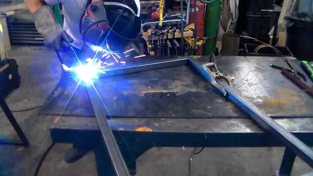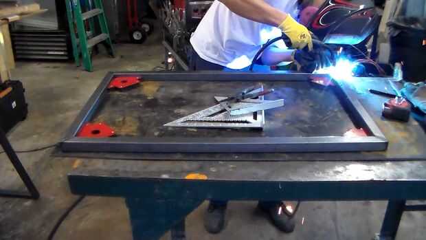 Tachuela Suelde todas las articulaciones. Cortes a inglete en tubo cuadrado de distorsionan fácilmente durante las soldaduras, por lo que es una buena idea de poner 2 tachuelas en cada cara de la articulación.