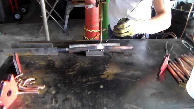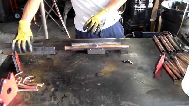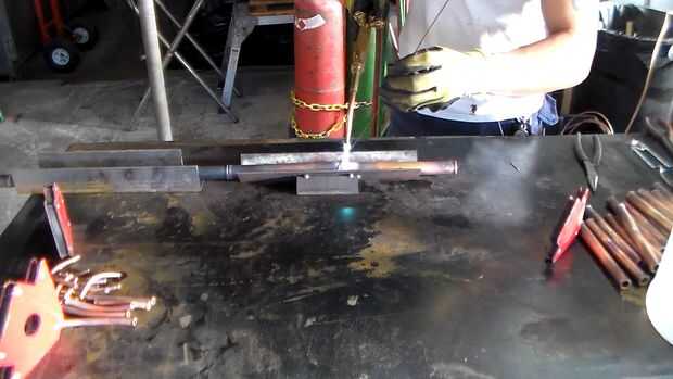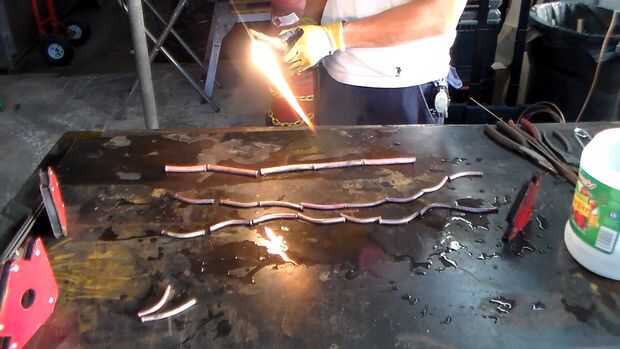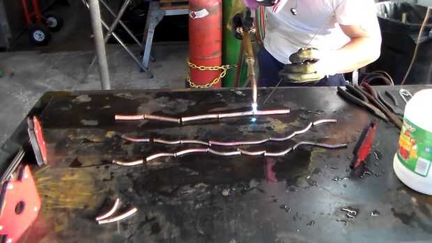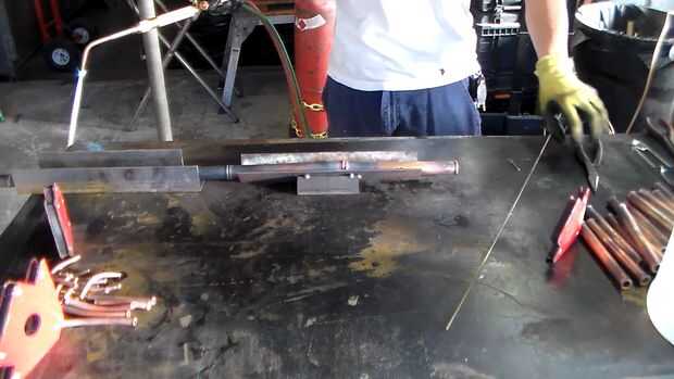 Calentar la junta con un soplete de oxiacetileno y soldar la junta con varilla de latón. Gire el tubo y continuar hasta la articulación es soldar un completo 360°. Una vez que esta junta, deslícelo sobre y empezar de nuevo con una nueva pieza. Desea hacer esto hasta que las secciones son de 3 pies o más.
