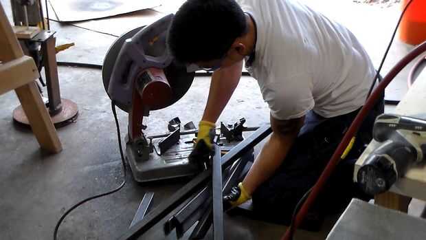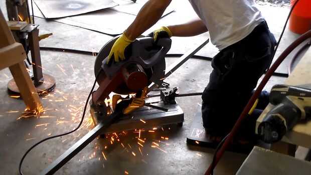 Configurar mi chuleta de sierra a un ángulo de corte 45°, medido hacia fuera el tubo cuadrado y cortar de mi. Usando una chuleta de sierra voluntad requiere un poco de final presentación y pulido para crear un corte liso.
