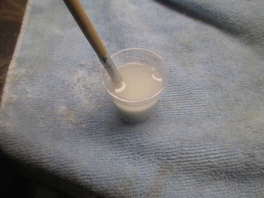 Para el flujo, usé dos cucharadas de bórax en agua limpia. Mezclado y cepillado en con pincel de un artista nuevo. Aplique fundente todo el camino alrededor de la pila. Esto evitará la oxidación de los metales y reducir el riesgo de tener una soldadura mala en las capas.