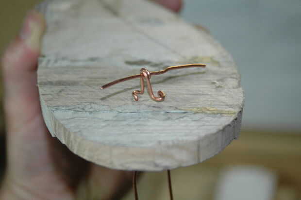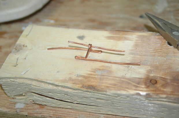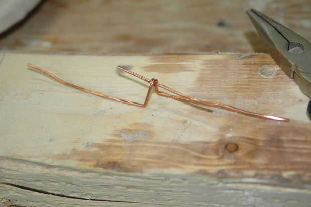 Para obtener este derecho, que experimentó primero y consiguió algunas de las fotos de esa manera. Básicamente comienzas con un alambre de aproximadamente diez pulgadas de largo que una vez enrollado alrededor de la parte de la rama que se unirá a. Ahora tienes dos patas colgando hacia abajo de la rama, y doblarlas a 90 grados donde usted quiere las zapatas Esto determinará qué tan alto hasta por encima de la madera que será esta parte de la rama. Doble los pies detrás en sí mismos otra vez y luego doblarlas una última vez para que continuar hacia abajo, paralelo al resto de la pierna.