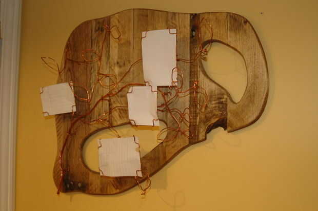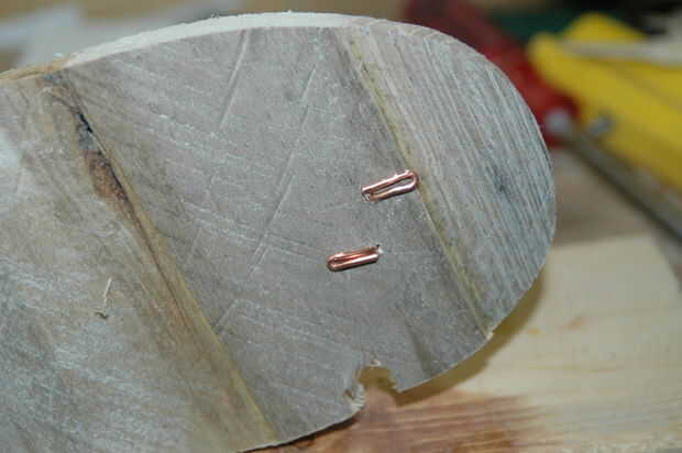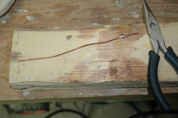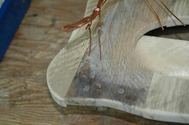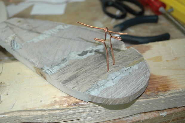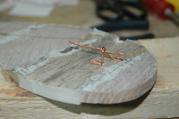 Después de todo es seco (tardará un buen día o dos si usted sigue las instrucciones del fabricante y aplique varias capas), puede volver a montar la rama en la base. Inserte los accesorios de cobre en sus agujeros y con sus pies firmemente en la parte delantera de la madera, doblar los cables en la parte posterior, doblarlas hacia atrás otra vez y cortar los excesos el. No sé el final de la curva-back es realmente necesario, pero acabo de conseguir en el hábito de hacerlo.