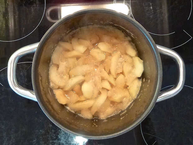 Pelar las manzanas y cortarlas en trozos. Tuve la suerte de tener una bolsa en el congelador (esta es buena idea si le sucede que aparece un montón de manzanas más que usted necesita a la vez - pero las manzanas congeladas son mejores adecuadas para cocinar, no comer crudo). Agregar las manzanas en una olla junto con el agua, jugo de limón, azúcar y canela. Cocinar por unos minutos hasta que las manzanas estén suaves. Prueba de suavidad que recorrer, esto variará.