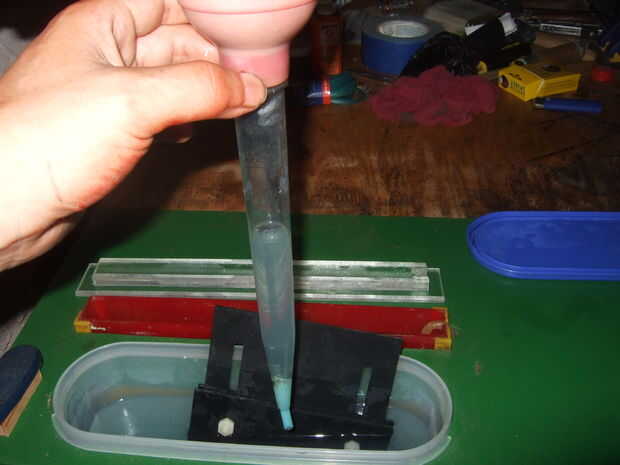 Otro tema con un tanque vertical delgado es mantenimiento de tanque. El labio fino del tanque hace difícil extraer el grabador ricos en cobre que se acumula y vierta en la solución más ácida. Para eliminar el desorden, finalmente he encontrado las herramientas correctas para el trabajo. Una jeringuilla para pavo alcanza fácilmente en el tanque para extraer la solución. Y para eliminar las gotas, encontré que podía rellenar un pedazo de tubo de acuario de silicona en la punta. El tubo está sellado por fusión en el interior extremo y varios pequeños agujeros son perforados en él. Y para agregar la solución ácida, guardo una botella de squirt de ácido y uno de agua (realmente agua del 97%, 3% de peróxido) en botellas de spray. Las botellas de spray son convenientes para la adición de la solución directamente al tanque. También, usted puede rociar la Junta directamente, si tu grabador muere antes de hace una junta. Una tercera razón que estas soluciones en botellas del aerosol es que son lo que usted necesita para eliminar las manchas de grabador! Si se derrama cualquier grabador en concreto, por ejemplo, una manguera con agua. Luego rocía el lugar con H202. Finalmente rocíe un poco de ácido sobre ella, luego lavar después de sólo un par de segundos. Mancha ha ido! (Use siempre protección ocular cuando maneje ácidos fuertes. Y asegúrese de exprimir parte del aire de la botella de ácido antes de cerrarlo, o algunos se gotear hacia fuera cuando la temperatura ambiente se eleva)