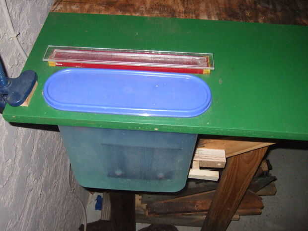 El primer número con un tanque vertical etch es espacio. Se supone que ahorra mucho espacio. Mi actual etch el tanque es de 11" x 11" de ancho x sólo 1" de espesor alto. Es una huella de 11 pulgadas cuadradas. Pero en realidad, necesita una estable base para el tanque. Así que en lugar de tomar un 20% del espacio de un tanque comparable, termina por tomar, digamos, 40% del espacio. ¿Eso está todavía muy bien, bien? Bueno, de eso, se necesita agua. Cuando la junta sale, necesita coger los goteos y enjuague la Junta. Estaba usando un vaso hornear para esto. Así que ahora estoy hasta el 75-80% del espacio que una configuración regular. Claramente, además de un tanque vertical de etch, necesita un tanque de enjuague vertical, demasiado. Y si tienes un banco al aire libre donde usted puede poner sus tanques, usted ni siquiera necesita una base!