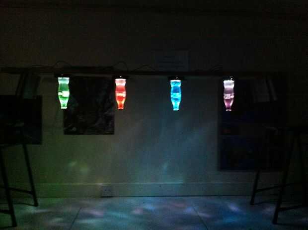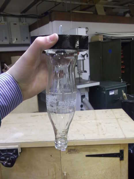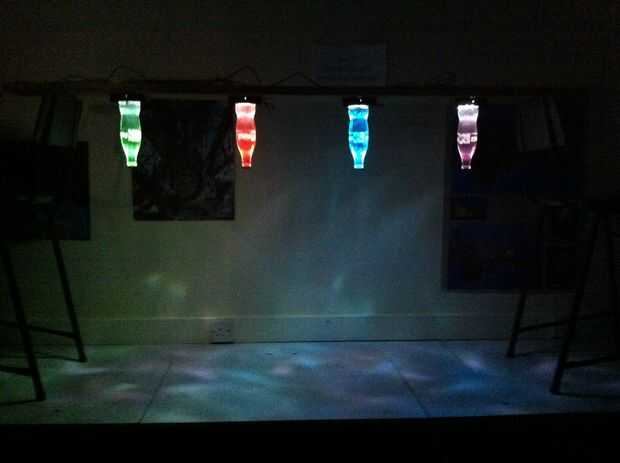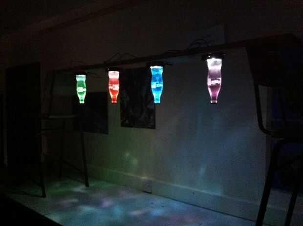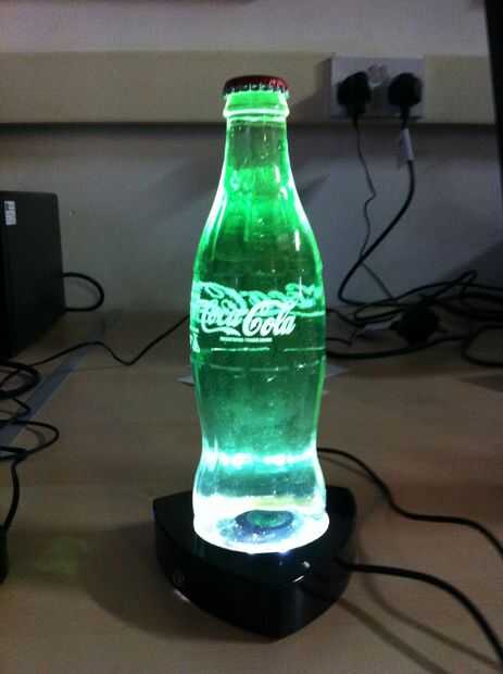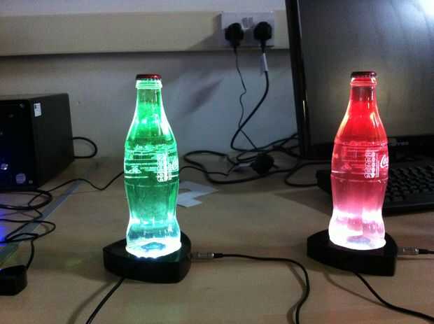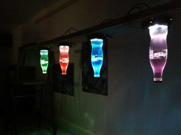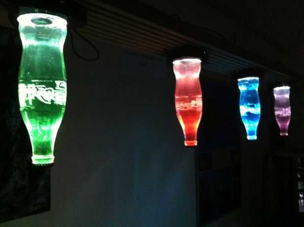 En términos simples es una botella de Coca-Cola llenada de agua coloreada, con tira de LEDs para encender para arriba. : P