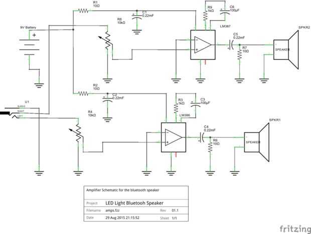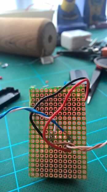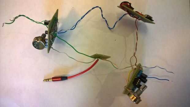 Después de terminar los dos amplificadores, utilice un pequeño pedazo de protoboard y algunos cables para dividir la señal de audio para los dos altavoces. Luego construir uso protoboard, cables, pinzas y pegamento caliente para construir el soporte de la batería.