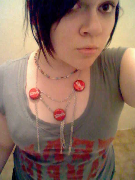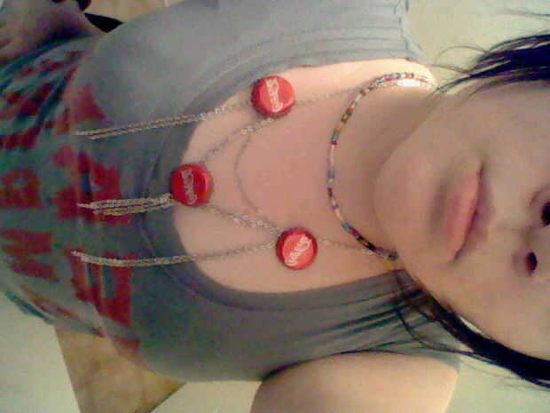 u tomar una cadena en el deseo de u tamaño y poner un broche. luego u Marque dos puntos en ella y pegamento caliente las dos tapas de coca cola. a continuación anuncio de u otra cadena entre ellos. una parte superior más entre la segunda cadena después añadir los otros dos en para oscile un poco = 3