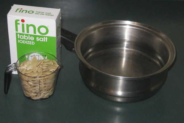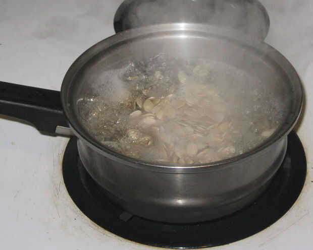 Medida de las semillas de calabaza en una taza de medida y un lugar en una olla. Agregue dos tazas de agua y una cuchara de sal por cada media taza de semillas de calabaza.