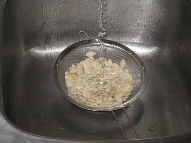 Limpie las semillas de calabaza con agua fría en un colador o tamiz para eliminar las partes fibrosas de la calabaza.