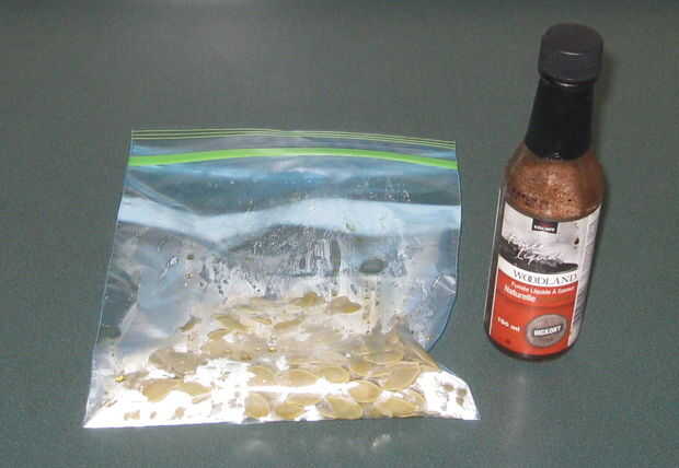 Por cada media taza de semillas de calabaza; Añadir a una bolsa de plástico 1 cucharadita líquido Hickory humo y 1/2 cucharadita de mantequilla, agitar hasta que se mezcle completamente. Extienda en una bandeja y al horno.
