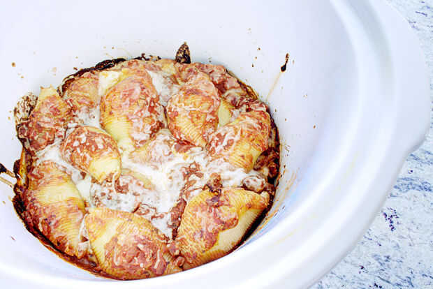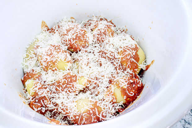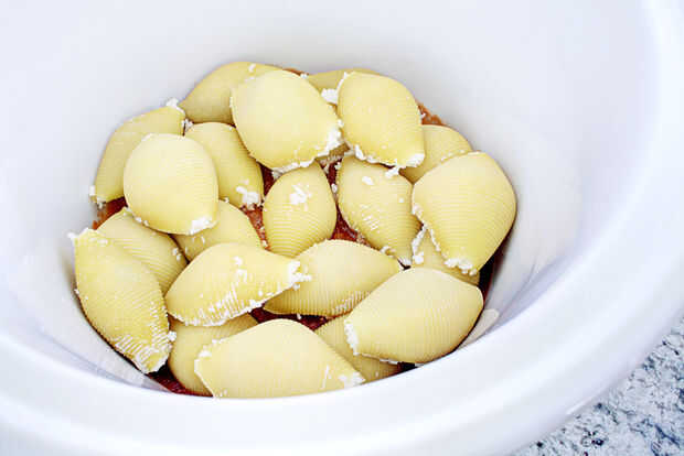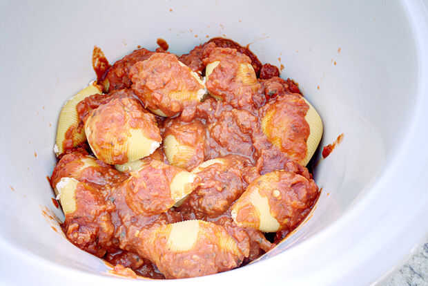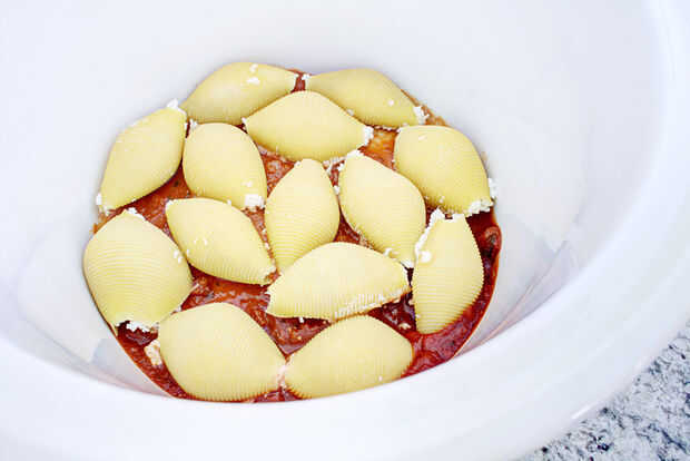 Superior de las conchas con poco más de salsa. No necesitan nadar en una piscina de salsa. Espolvorear sobre un relleno de queso y cocine en baja por 2 a 3 horas o en alta de 60-90 minutos. Compruebe cómo hecho estaban tratando los pinchar fácilmente con un tenedor. Hemos encontrado cocina baja resultó mejor cáscaras.